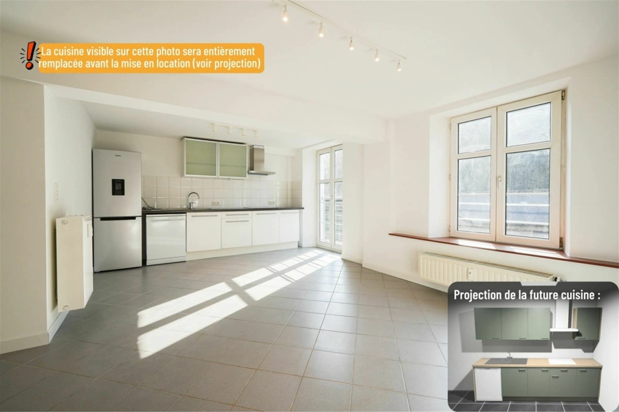 Situé non loin du centre de Ciney et de Leignon, nous vous présentons ce superbe appartement rénové en 2025. D'une superficie d'environ 60m², le logement offre une belle cuisine équipée et ouverte sur le salon, une salle de bain avec sa toilette et deux chambres chacune de 11m². La disposition des pièces de vie vous permet de profiter d'un espace lumineux et ce, tout au long de la journée. L'appartement dispose également d'une place de parking extérieure. Les nombreuses rénovations effectuées en 2025 vous garantirons un bâtiments en ordre; réfection des parkings, installation de nouvelles portes d'entrée, modernisation des parlophones, aménagement d'un local poubelle. Libre : à partir du 01/05/2026 Loyer: 725,00 €/mois Charge: 150,00 €/mois (Eau, chauffage privatif, communs) Pour organiser une visite, contactez l’Agence Petyt au 081/44.40.22 (option, 2) ou via location@agencepetyt.be