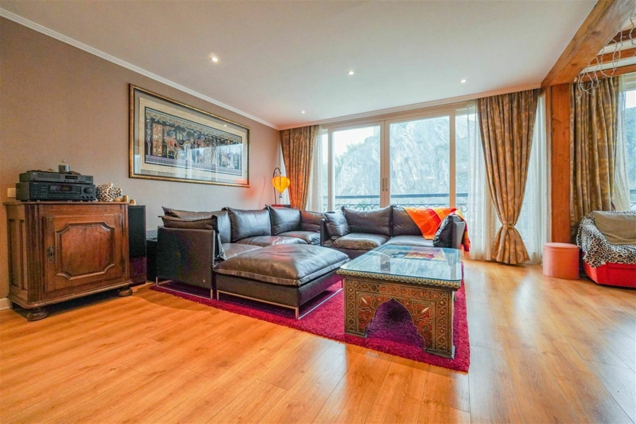 Face à la Meuse et à la majestueuse Citadelle de Dinant, ce splendide appartement situé au 3e étage développe ± 130 m² et offre un cadre de vie tout simplement remarquable. Depuis le séjour, la SAM, la cuisine ouverte et même la chambre principale, la vue s’étend largement sur les joyaux dinantais. Un panorama vivant, dont on ne se lasse jamais. Baigné de lumière naturelle grâce à ses nombreuses baies vitrées, l’appartement séduit par ses volumes généreux et son atmosphère chaleureuse. La pièce de vie, spacieuse et conviviale, a été pensée pour recevoir et profiter pleinement de chaque instant. L’ensemble a été entièrement rénové en 2013/2014 et se présente aujourd’hui dans un état irréprochable. L’installation électrique est conforme. L’espace nuit se compose de 2 chambres et d’1 bureau séparé. Deux salles de douche/bain complètent l’ensemble. La résidence est équipée d’un ascenseur, facilitant l’accès au 3e étage. Une cave, incluse dans le prix, vient compléter ce bel appartement. Un double emplacement de parking couvert est également disponible au prix de 25 000€. Un appartement lumineux, spacieux et parfaitement entretenu, qui combine confort moderne et vue d’exception. Une opportunité à découvrir sans tarder. Pour organiser une visite, contactez l’Agence Petyt au 081/44.40.22 ou par mail à contact@agencepetyt.be